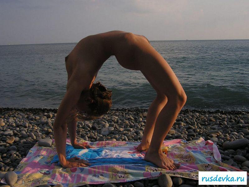 Нам выпадает уникальный шанс посмотреть, как одна девка днём резвится на пляже усыпанной галькой, а на закате сидя на покрывале будет медитировать. Наверно уходящие за горизонт солнце, последними лучами согревает соблазнительное тело, напоминая о том, что завтра будет новый день и веселья. Нудистка свободно бегает голышом, не заботясь о своём виде, ведь таких, как она, много и пока есть возможность, и сиськи с киской выглядят привлекательно, надо отрываться на полную.