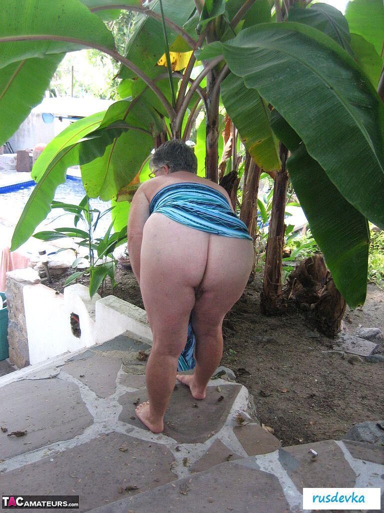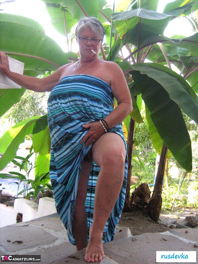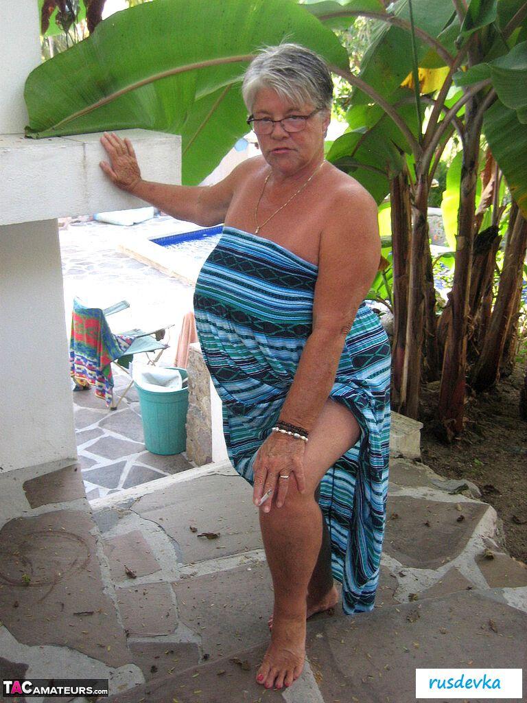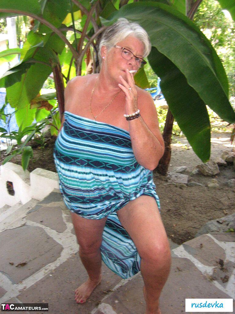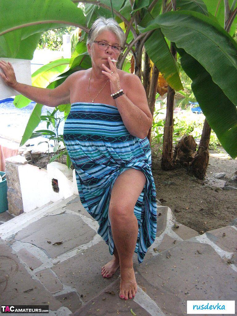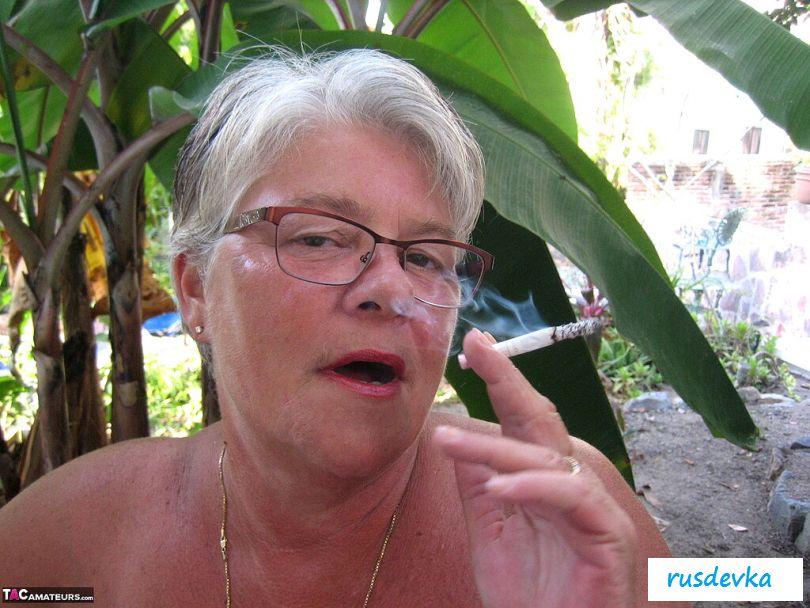 Посмотрите только, что на ню фотографиях вытворяет эта похотливая и полностью обнаженная старушка в очках и с сигаретой? В этот жаркий день на пляже хулиганка в возрасте показывает гордо большую аппетитную задницу и огромные обвисшие сиськи, от которых порой даже молодые парни сходят с ума. Изобретательная и слишком горячая баба без бикини показывает на свежем воздухе все свои женские прелести, чтобы порадовать поклонников и от души повеселиться, кайфуя в летний жаркий день.