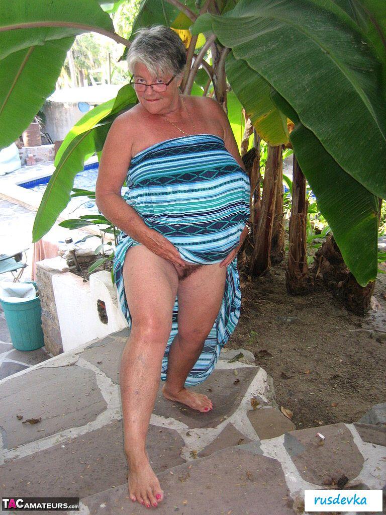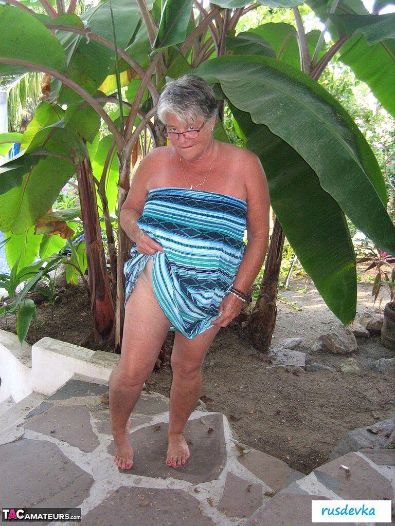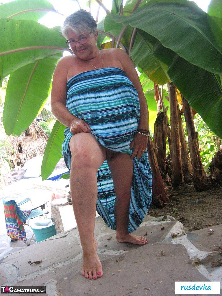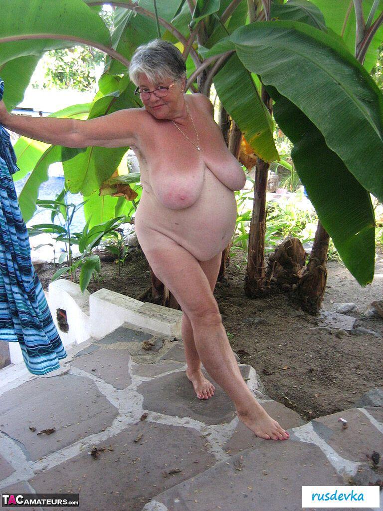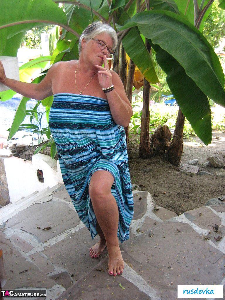 Посмотрите только, что на ню фотографиях вытворяет эта похотливая и полностью обнаженная старушка в очках и с сигаретой? В этот жаркий день на пляже хулиганка в возрасте показывает гордо большую аппетитную задницу и огромные обвисшие сиськи, от которых порой даже молодые парни сходят с ума. Изобретательная и слишком горячая баба без бикини показывает на свежем воздухе все свои женские прелести, чтобы порадовать поклонников и от души повеселиться, кайфуя в летний жаркий день.