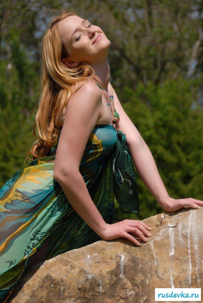 Россия славится не только красивыми пейзажами, но и приятными сексуальным и девушками! Дама осматривает красоты и показывает нам свои - это ее голенькое тело и титьки. Она присела у большого пня и раздвинула ноги в позе йоги. Розовая трещинка загорает.