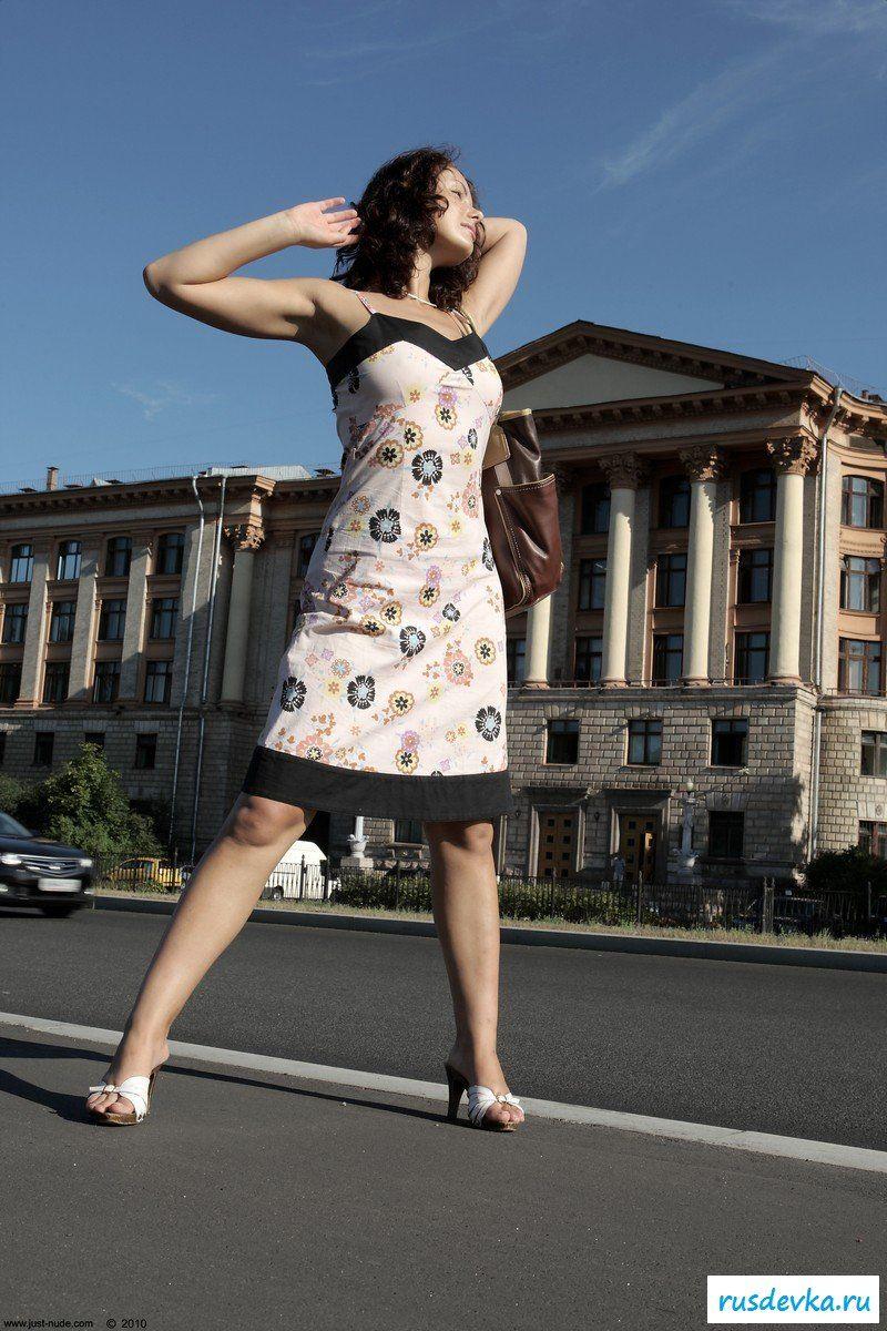 красотка прогуливалась с подружкой по шумному городу. Подружка попросила ее раздеться на фоне красивого здания. Почему бы и нет, ведь на улице так жарко а у девушки такие красивые сиськи и маленькая нежная пися. Она стащила с себя красивое платьице и присела на дорожку.